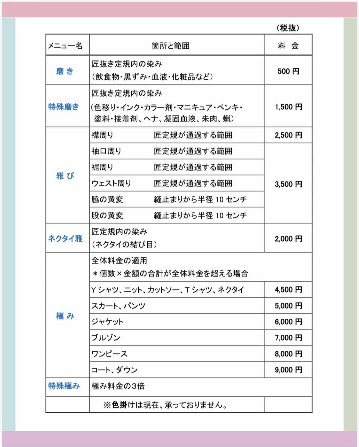 さいたま市大宮区のわがクリーニングは、エコクリーニングの技術を取り入れています。 TOPPAGEトップページ LOHASクリーン&ケア DELIVERYデリバリー・集配 CLEANING匠抜き REFORM衣類のお直し COMPANY会社概要 RECRUIT採用情報 ACCESSアクセス HOMEお知らせ感動しみ抜き【匠抜き】料金の改定のお知らせ 新着情報 感動しみ抜き【匠抜き】料金の改定のお知らせ 2026年3月19日(4:57 PM) | カテゴリー:お知らせ,新着情報 〜【匠抜き】料金改定のお知らせ 〜 平素よりご愛顧いただき、誠にありがとうございます。 このたび、原材料費の高騰に伴い、誠に恐縮ではございますが、【匠抜き】(しみ抜き)料金を、下記の通り改定させていただくこととなりました。 ■ 改定日 2026年4月1日 ■ 改定内容 別表をご覧くださいませ 今後もより一層のサービス向上に努めてまいりますので、何卒ご理解賜りますようお願い申し上げます。 « 年末年始・休業のお知らせ 検索: